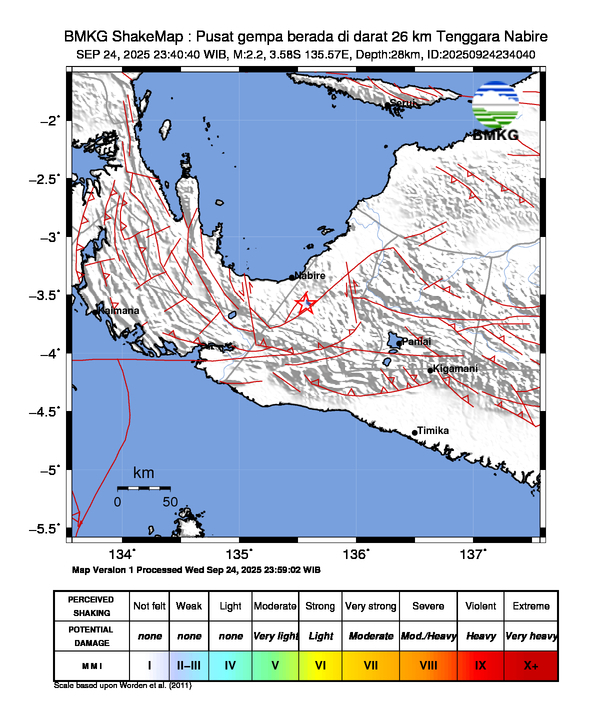 ZONAWARTA.COM – Telah terjadi gempa berkekuatan 2,2 Skala Richter (SR) yang terjadi pada 24/09/2025 23:40:40 WIB, pusat gempa berada di darat 26 km Tenggara Nabire dan gempa tersebut TIDAK BERPOTENSI TSUNAMI.