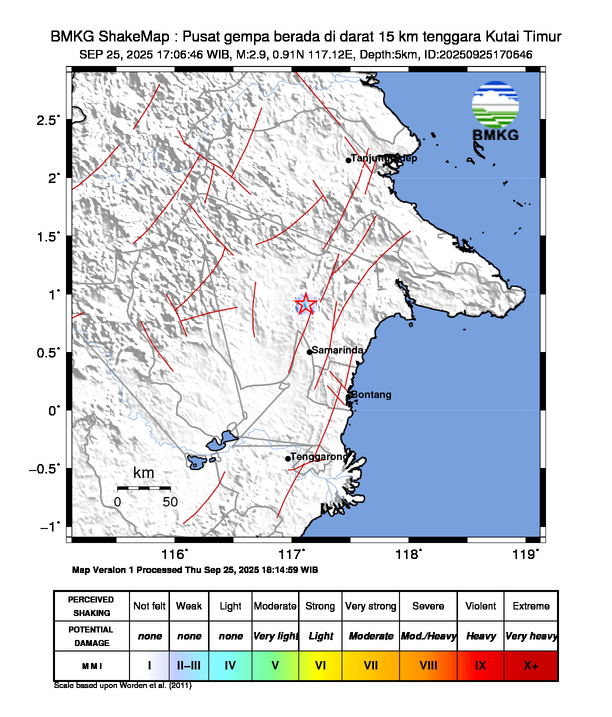 Berdasarkan informasi dari situs web resmi Badan Meteorologi, Klimatologi, dan Geofisika (BMKG), gempa terjadi di koordinat 0.91 LU 117.12 BT dengan kedalaman 5 km.
