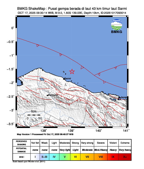 ZONAWARTA.COM – Telah terjadi gempa berkekuatan 3,0 Skala Richter (SR) yang terjadi pada 17/10/2025 09:30:14 WIB, pusat gempa berada di laut 43 km timur laut Sarmi dan gempa tersebut TIDAK BERPOTENSI TSUNAMI.