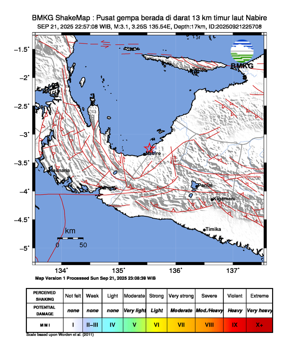 ZONAWARTA.COM – Telah terjadi gempa berkekuatan 3,1 Skala Richter (SR) yang terjadi pada 21/09/2025 22:57:08 WIB, pusat gempa berada di darat 13 km timur laut Nabire dan gempa tersebut TIDAK BERPOTENSI TSUNAMI.