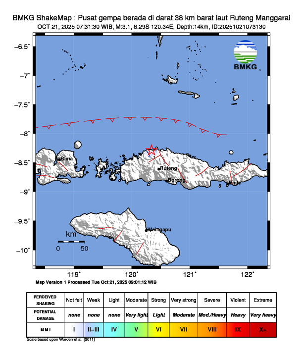 ZONAWARTA.COM – Telah terjadi gempa berkekuatan 3,1 Skala Richter (SR) pada 21 Oktober 2025 07:31:30 WIB, pusat gempa berada di darat 38 km barat laut Ruteng Manggarai.