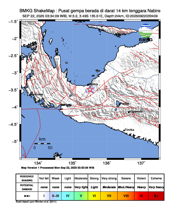 ZONAWARTA.COM – Telah terjadi gempa berkekuatan 3,2 Skala Richter (SR) pada 22 September 2025 03:34:09 WIB, pusat gempa berada di darat 14 km tenggara Nabire.