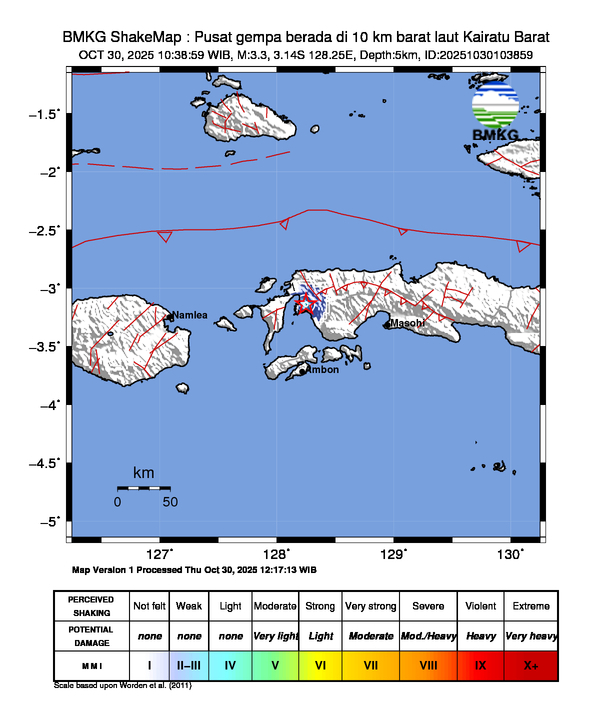 Berdasarkan informasi dari situs web resmi Badan Meteorologi, Klimatologi, dan Geofisika (BMKG), gempa terjadi di koordinat 3.14 LS 128.25 BT dengan kedalaman 5 km.