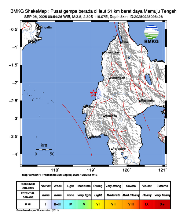 ZONAWARTA.COM – Telah terjadi gempa berkekuatan 3,5 Skala Richter (SR) yang terjadi pada 28/09/2025 09:54:26 WIB, pusat gempa berada di laut 51 km barat daya Mamuju Tengah dan gempa tersebut TIDAK BERPOTENSI TSUNAMI.