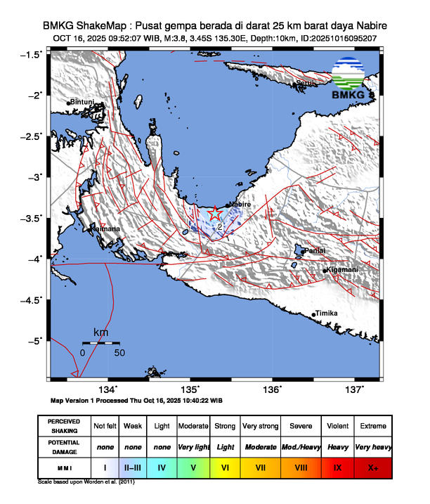 ZONAWARTA.COM – Telah terjadi gempa berkekuatan 3,8 Skala Richter (SR) yang terjadi pada 16/10/2025 09:52:07 WIB, pusat gempa berada di darat 25 km barat daya Nabire dan gempa tersebut TIDAK BERPOTENSI TSUNAMI.