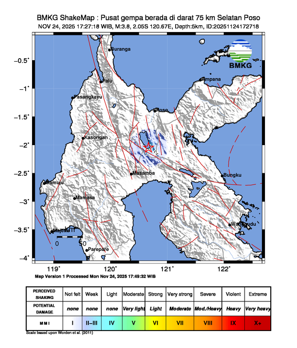 ZONAWARTA.COM – Telah terjadi gempa berkekuatan 3,8 Skala Richter (SR) yang terjadi pada 24/11/2025 17:27:18 WIB, pusat gempa berada di darat 75 km Selatan Poso dan gempa tersebut TIDAK BERPOTENSI TSUNAMI.