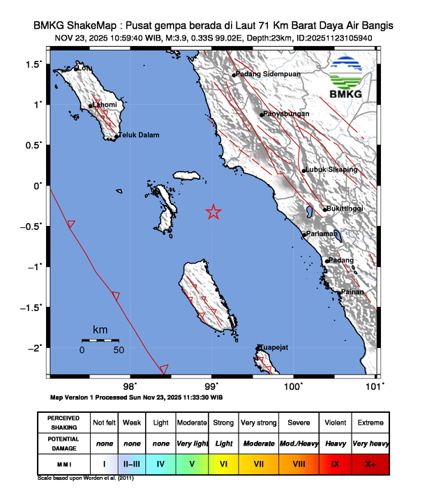 Berdasarkan informasi dari situs web resmi Badan Meteorologi, Klimatologi, dan Geofisika (BMKG), gempa terjadi di koordinat 0.33 LS 99.02 BT dengan kedalaman 23 km.