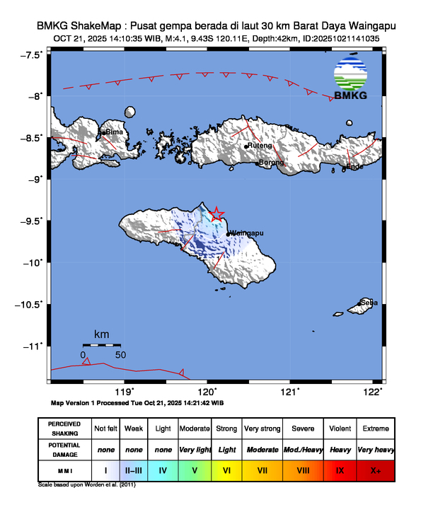 ZONAWARTA.COM – Telah terjadi gempa berkekuatan 4,1 Skala Richter (SR) yang terjadi pada 21/10/2025 14:10:35 WIB, pusat gempa berada di laut 30 km Barat Daya Waingapu dan gempa tersebut TIDAK BERPOTENSI TSUNAMI.