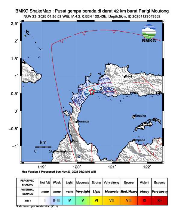ZONAWARTA.COM – Telah terjadi gempa berkekuatan 4,2 Skala Richter (SR) yang terjadi pada 23/11/2025 04:36:52 WIB, pusat gempa berada di darat 42 km barat Parigi Moutong dan gempa tersebut TIDAK BERPOTENSI TSUNAMI.