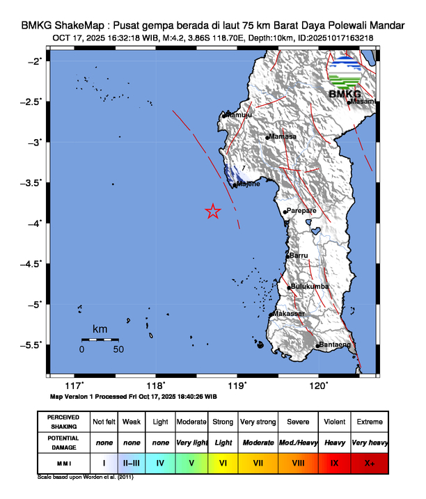 ZONAWARTA.COM – Telah terjadi gempa berkekuatan 4,2 Skala Richter (SR) pada 17 Oktober 2025 16:32:18 WIB, pusat gempa berada di laut 75 km Barat Daya Polewali Mandar.
