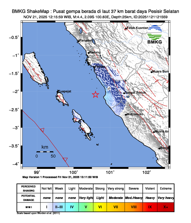 Gempa Berkekuatan 4,4 SR, pusat gempa berada di laut 7 km barat daya Pesisir Selatan