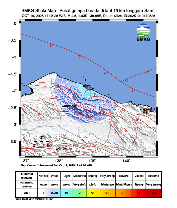 ZONAWARTA.COM – Telah terjadi gempa berkekuatan 4,5 Skala Richter (SR) yang terjadi pada 19/10/2025 17:05:26 WIB, pusat gempa berada di laut 15 km tenggara Sarmi dan gempa tersebut TIDAK BERPOTENSI TSUNAMI.