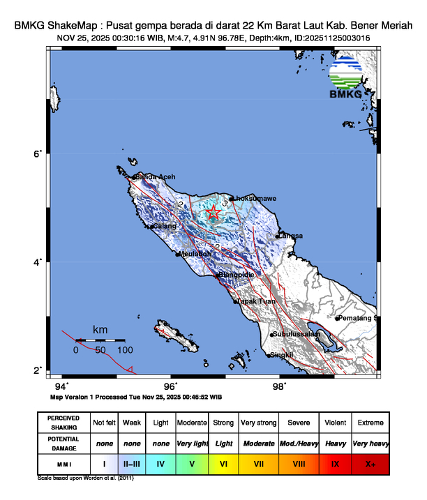 ZONAWARTA.COM – Telah terjadi gempa berkekuatan 4,7 Skala Richter (SR) pada 25 November 2025 00:30:16 WIB, pusat gempa berada di darat 22 Km Barat Laut Kab. Bener Meriah.