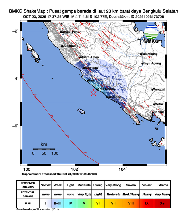 Gempa Berkekuatan 4,7 SR, pusat gempa berada di laut 23 km barat daya Bengkulu Selatan