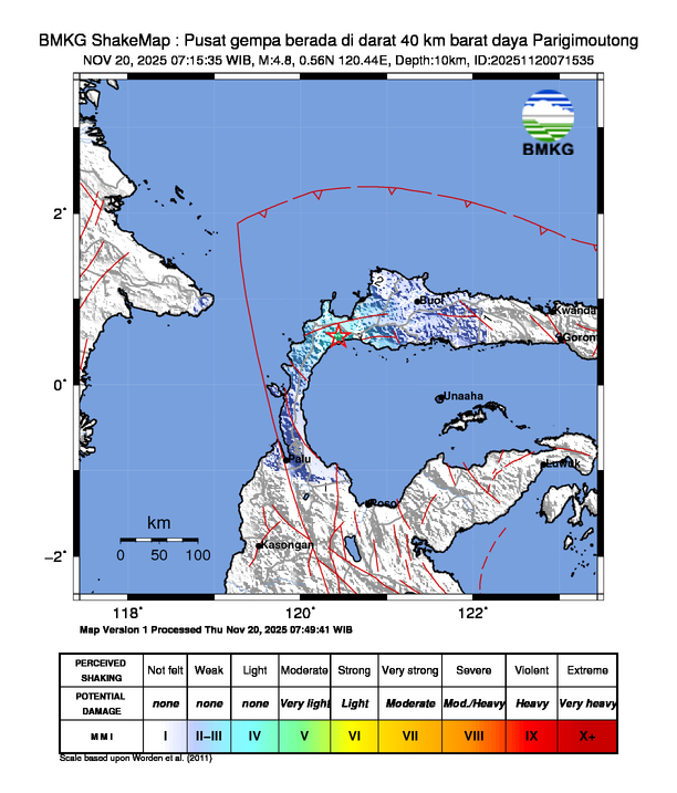 ZONAWARTA.COM – Telah terjadi gempa berkekuatan 4,8 Skala Richter (SR) yang terjadi pada 20/11/2025 07:15:35 WIB, pusat gempa berada di darat 40 km barat daya Parigimoutong dan gempa tersebut TIDAK BERPOTENSI TSUNAMI.