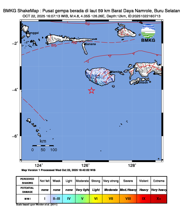 ZONAWARTA.COM – Telah terjadi gempa berkekuatan 4,8 Skala Richter (SR) yang terjadi pada 22/10/2025 16:07:13 WIB, pusat gempa berada di laut 59 km Barat Daya Namrole, Buru Selatan dan gempa tersebut TIDAK BERPOTENSI TSUNAMI.