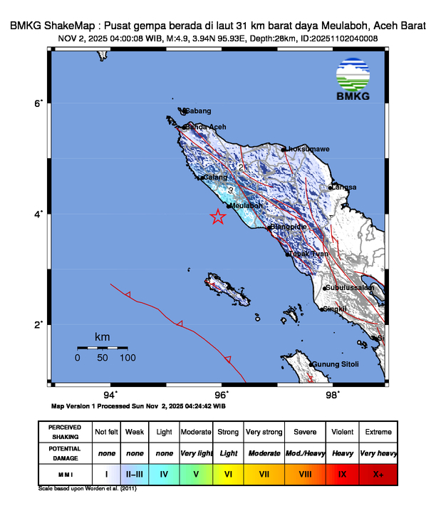 Gempa Berkekuatan 4,9 SR, pusat gempa berada di laut 31 km barat daya Meulaboh, Aceh Barat