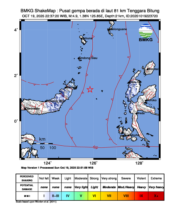 ZONAWARTA.COM – Telah terjadi gempa berkekuatan 4,9 Skala Richter (SR) yang terjadi pada 19/10/2025 22:37:20 WIB, pusat gempa berada di laut 81 km Tenggara Bitung dan gempa tersebut TIDAK BERPOTENSI TSUNAMI.