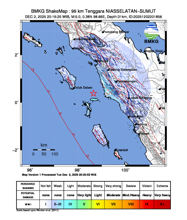 ZONAWARTA.COM – Telah terjadi gempa berkekuatan 5,0 Skala Richter (SR) pada 02 Desember 2025 20:16:25 WIB, 96 km Tenggara NIASSELATAN-SUMUT.