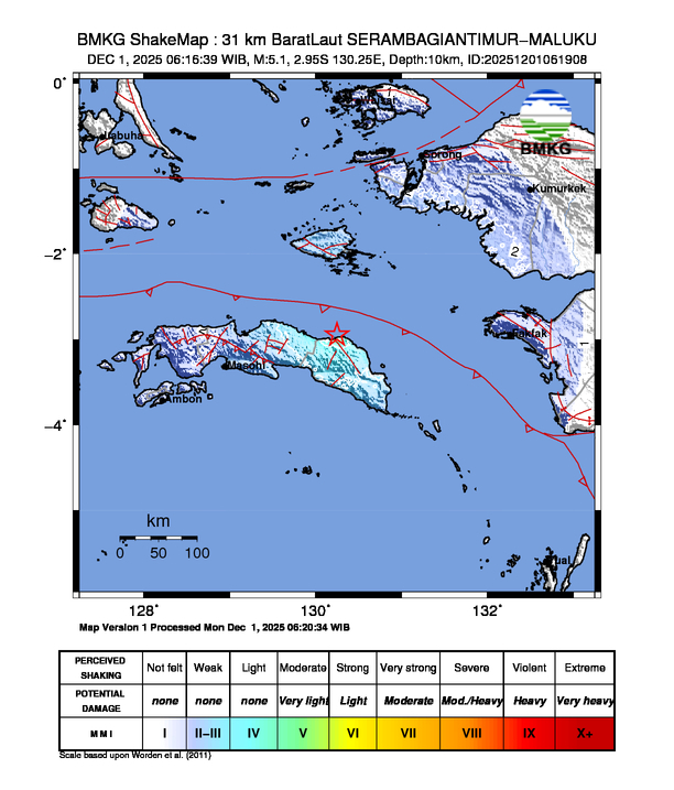 ZONAWARTA.COM – Telah terjadi gempa berkekuatan 5,1 Skala Richter (SR) yang terjadi pada 01/12/2025 06:16:39 WIB, 31 km BaratLaut SERAMBAGIANTIMUR-MALUKU dan gempa tersebut TIDAK BERPOTENSI TSUNAMI.