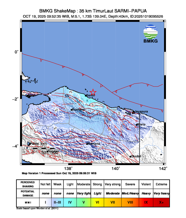 ZONAWARTA.COM – Telah terjadi gempa berkekuatan 5,1 Skala Richter (SR) pada 19 Oktober 2025 09:52:35 WIB, 35 km TimurLaut SARMI-PAPUA.