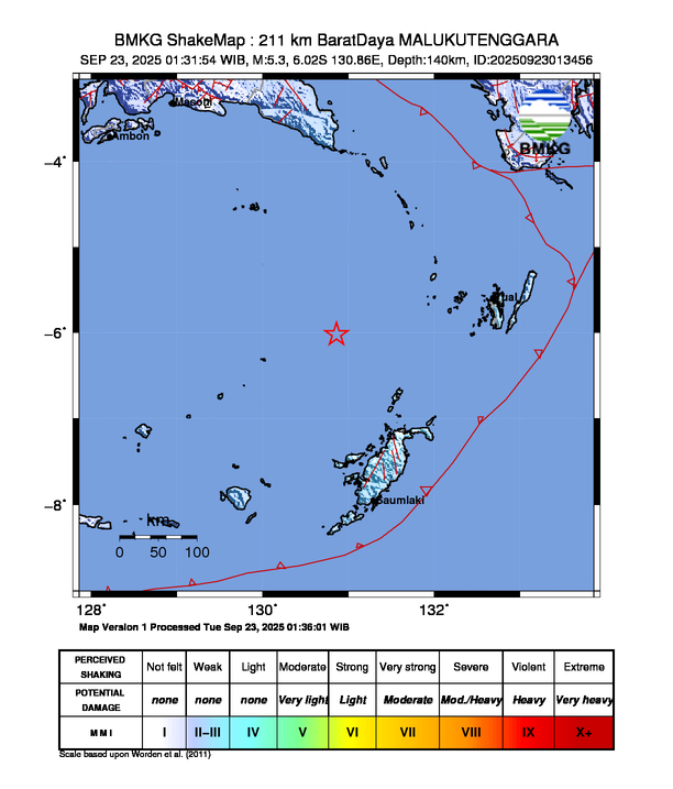 ZONAWARTA.COM – Telah terjadi gempa berkekuatan 5,3 Skala Richter (SR) pada 23 September 2025 01:31:54 WIB, 211 km BaratDaya MALUKUTENGGARA.