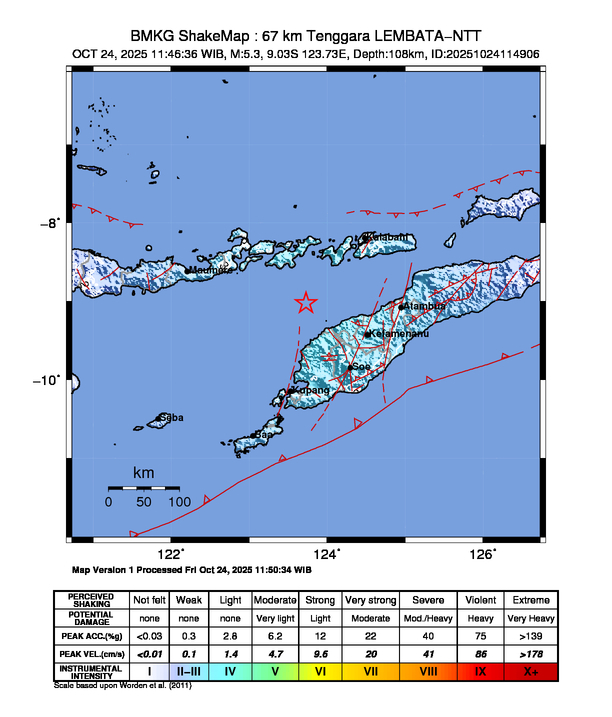 ZONAWARTA.COM – Telah terjadi gempa berkekuatan 5,3 Skala Richter (SR) yang terjadi pada 24/10/2025 11:46:36 WIB, 67 km Tenggara LEMBATA-NTT dan gempa tersebut TIDAK BERPOTENSI TSUNAMI.