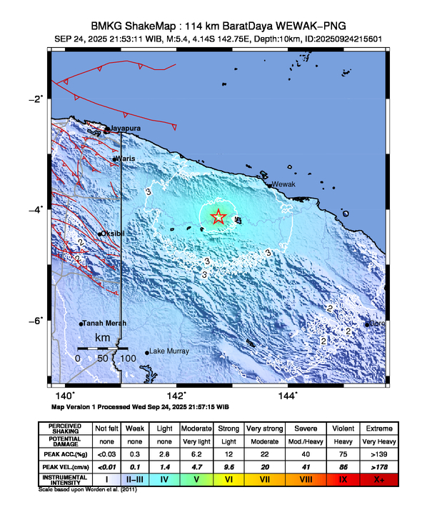 ZONAWARTA.COM – Telah terjadi gempa berkekuatan 5,4 Skala Richter (SR) pada 24 September 2025 21:53:11 WIB, 114 km BaratDaya WEWAK-PNG.