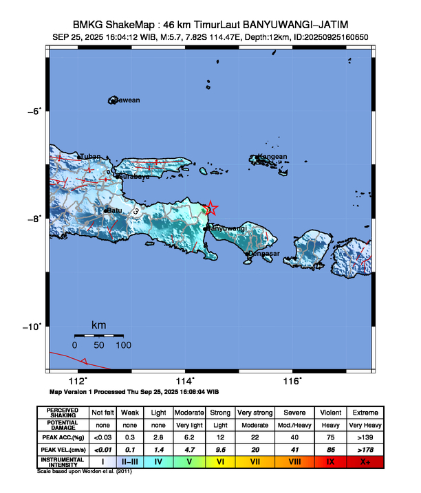 Gempa Berkekuatan 5,7 SR di 46 km TimurLaut BANYUWANGI-JATIM Tidak Berpotensi Tsunami