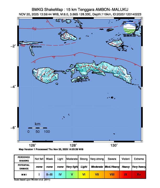 ZONAWARTA.COM – Telah terjadi gempa berkekuatan 6,0 Skala Richter (SR) yang terjadi pada 20/11/2025 13:59:44 WIB, 15 km Tenggara AMBON-MALUKU dan gempa tersebut TIDAK BERPOTENSI TSUNAMI.
