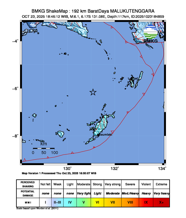 Berdasarkan informasi dari situs web resmi Badan Meteorologi, Klimatologi, dan Geofisika (BMKG), gempa terjadi di koordinat 6.17 LS 131.08 BT dengan kedalaman 117 km.