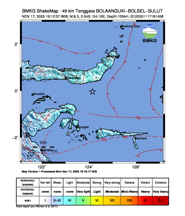 ZONAWARTA.COM – Telah terjadi gempa berkekuatan 6,2 Skala Richter (SR) yang terjadi pada 17/11/2025 19:12:37 WIB, 49 km Tenggara BOLAANGUKI-BOLSEL-SULUT dan gempa tersebut TIDAK BERPOTENSI TSUNAMI.