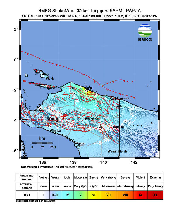 ZONAWARTA.COM – Telah terjadi gempa berkekuatan 6,6 Skala Richter (SR) pada 16 Oktober 2025 12:48:53 WIB, 32 km Tenggara SARMI-PAPUA.